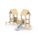 The playset RB-0011 consists of two playhouses with a roof, a platform without a roof, a climbing net, a bridge, a slide, rotating elements and a bench. The construction is made of robinia wood. The roofs, fences and floors are made of robinia boards with a minimum thickness of 25 mm. Robinia wood is of high quality and resistant to all weather conditions. The slide is made of stainless steel. Climbing nets are made of polypropylene ropes with a steel core with a diameter of 16 mm, connected with aluminum or plastic connectors. The bridge is made of non-slip material. The device has no cracks or sharp edges that could pose a risk of injury while playing.
