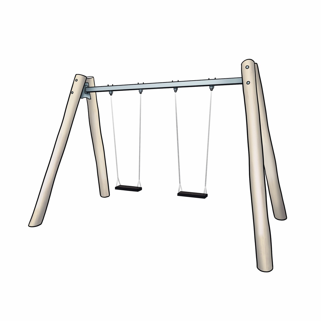 The swing is made of black locust trunks with a diameter of 14-18 mm and a metal support beam measuring 100x80 mm, connected by a metal plate and HDPE plastic. The support beam is also available in robinia. The swing seats are connected to the support beam using stainless steel chains and supports. The swing supports are removable for maintenance purposes and attach to the support beams.